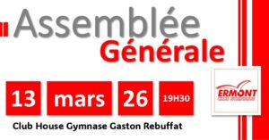 Chers adhérents, chères adhérentes, La prochaine Assemblée Générale de notre association se réunira le : Vendredi 13 mars 2026 à 19h30 Au Club House du Complexe Gaston Rebuffat 1 allée Jean de Florette – 95120 ERMONT. Les délibérations porteront sur l’ordre du jour suivant : 1° Rapport moral 2° Rapport technique 3° Rapport financier saison …