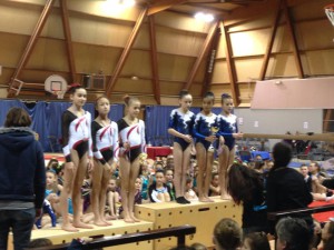 Une équipe benjamines avec Daphné, Fanny, Inès et Lise qui s’est malheureusement blessée lors de son passage aux barres. toutes les 4 se sont classées 3ème.